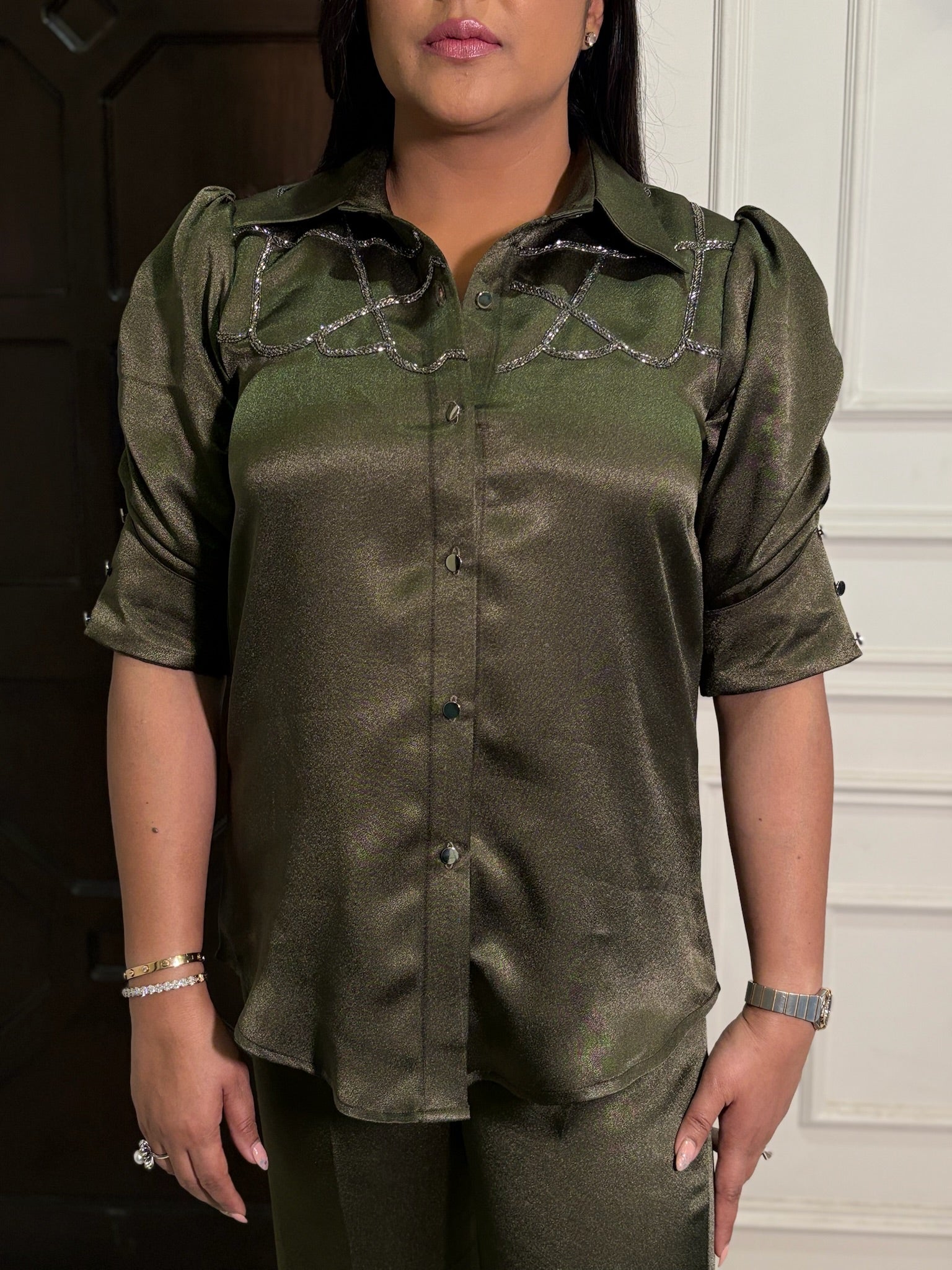 Elegant and chic, this outfit features a lustrous olive-green satin co-ord set with puffed sleeves and button detailing, paired with bootcut trousers.